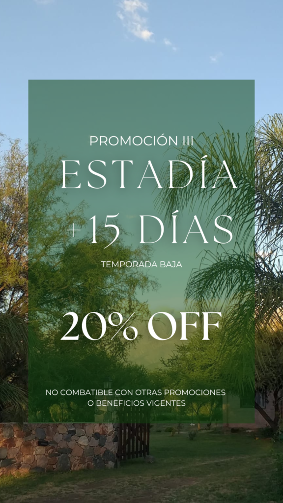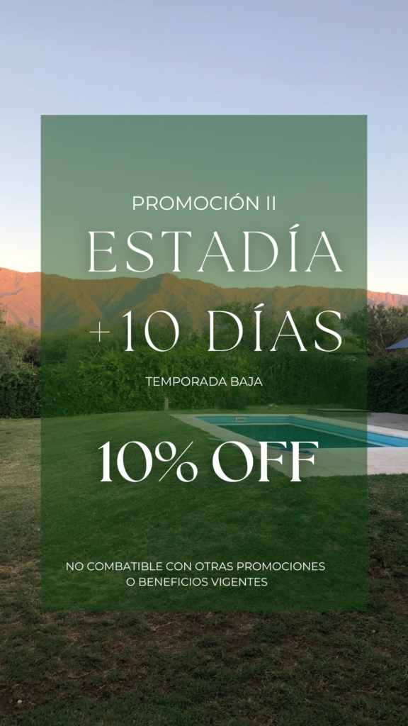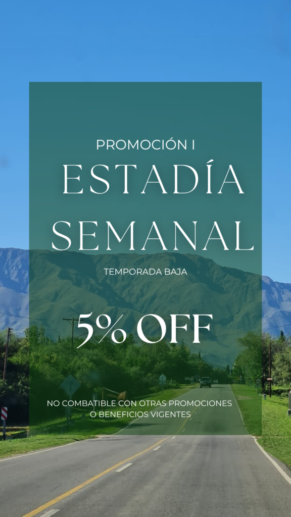 Contamos con las siguientes promociones vigentes para este 2023. Recordá que aplican sólo a temporada baja (Abril-Mayo-Junio-Agosto-Septiembre-Octubre) *Quedan excluidos los fines de semana largos y días feriados. QUIERO PROMO QUIERO PROMO QUIERO PROMO